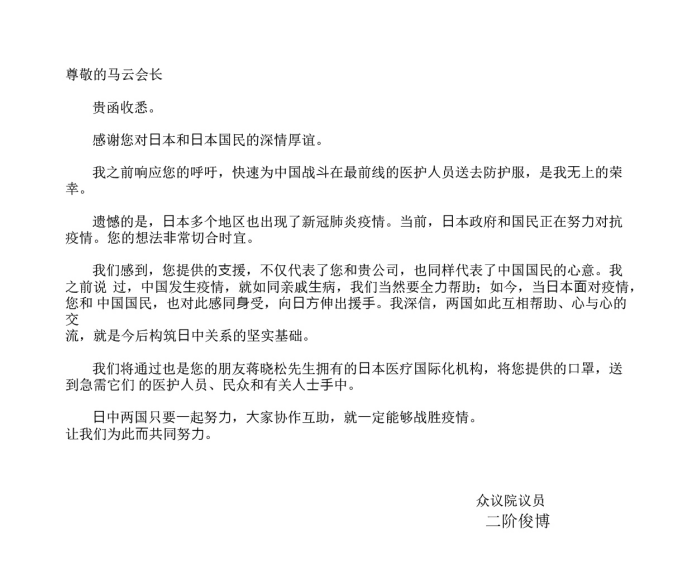 以下为马云致二阶俊博的信全文: