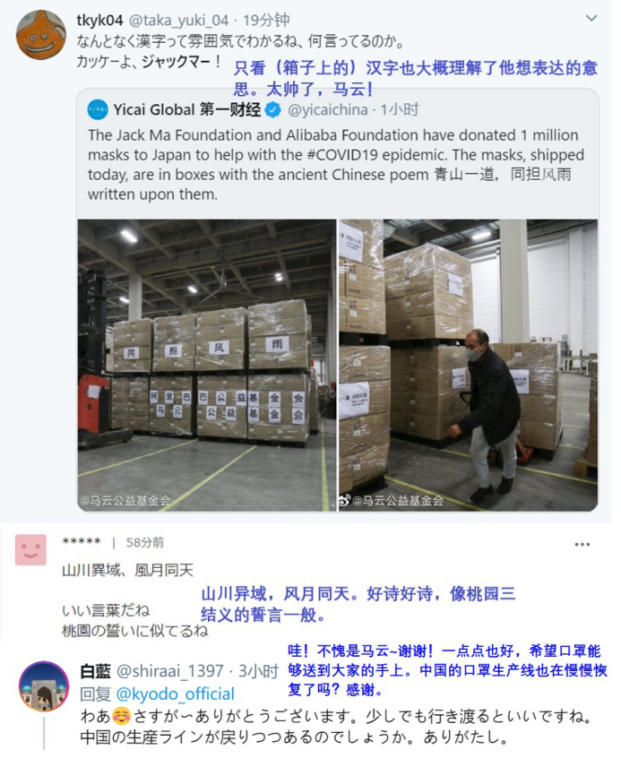 消息宣布之后,日本网友也被感动并纷纷点赞。这批口罩的包装盒外印上了“青山一道,同担风雨”的附言,也是对先前日本援助时“山川异域,风月同天”的呼应。通过文字,两国之间共克时艰的情谊在文化相通的中日两国网友之间引发共鸣。