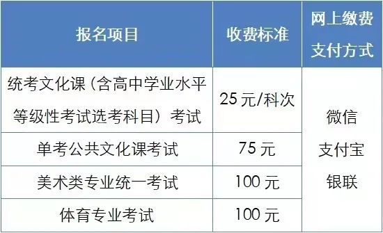 ● 统考考生要选择相应的报考科目、是否参加美术统考、是否参加体育专业考试等考试项目,网上支付总费用为以上所选项目考试费用总和。网上支付成功后考生的报考科目、是否参加美术统考、是否参加体育专业考试等考试信息不能更改。考生在网上报名期间如果要更改以上项目,可在考生基本信息页面中取消订单(按网上提示操作),然后重新选择相关项目进行缴费。原订单所缴费用将在报名资格确认后退回考生缴费所用账户。